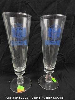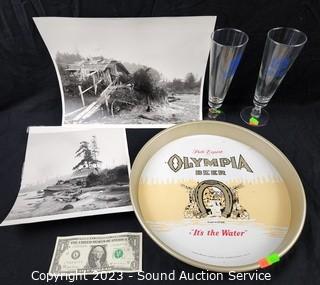 Lot #0041: Olympia Beer Tin, Glasses & B&W Cabin Photos