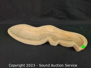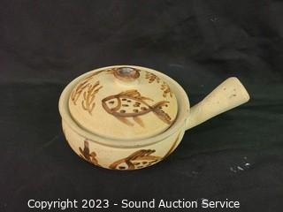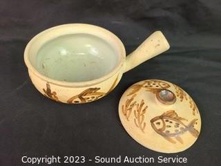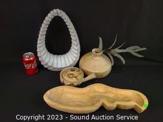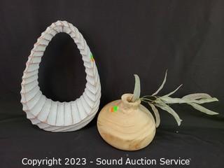 Lot Details: Handcrafted pottery pot w/lid, 5" H x 7.5" Dia Paulownia wood vase, hand carved natural wood dish, composite ring sculpture decor.