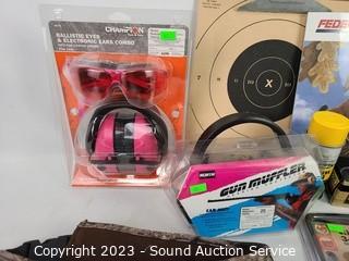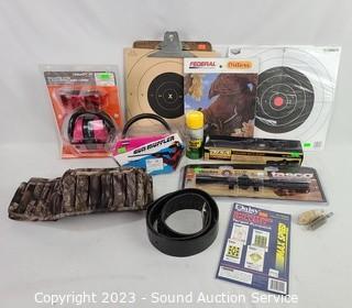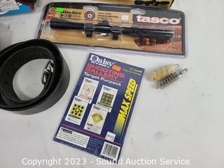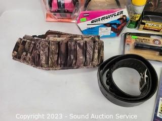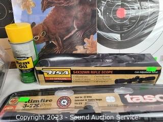 Lot Details: 2 scopes Tasco 3x7, BSA S4x32WR scopes, ear muffs, Remington leather shotgun ammo belt S:122 Lg, and camouflage belt, adjustable.