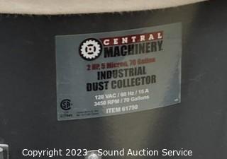 Lot Details: By central Machinery, 2 HP, 70 Gallon, Item #Comes with various lengths of 4" hoses. Overall 75" H x 33" x 21". Works.