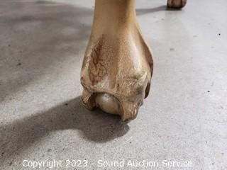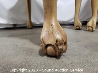 Lot Details: See a faint planter spot, ring on both. Ornate carved trim, claw foot, distressed finish. 24" H x 29" x 29".