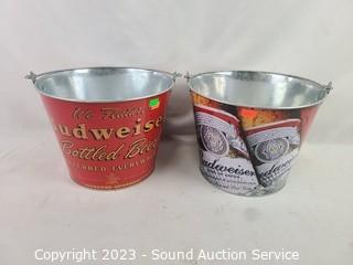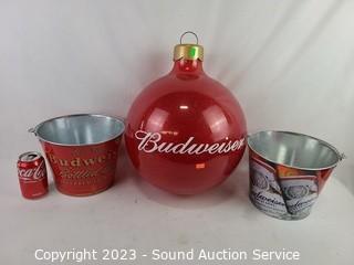 Lot #0122: 2 Budweiser Pails & Large Plastic Ornaments