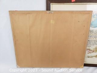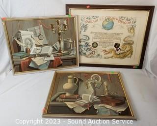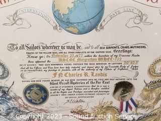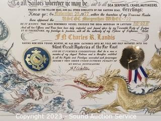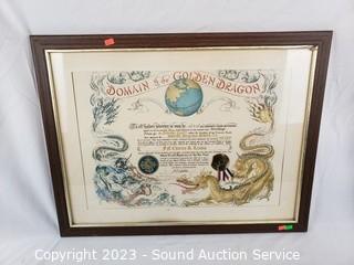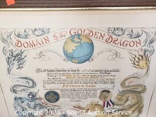 Lot Details: 17" x 21" Office/study paintings, don't see a signature. Domain of the Golden Dragon sailors certificate, 20" x 26".