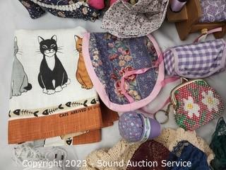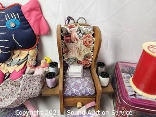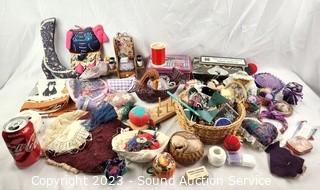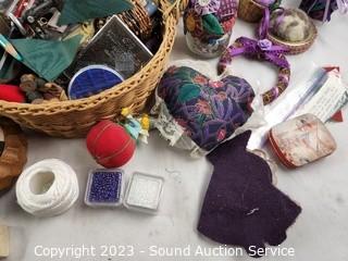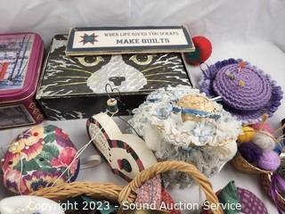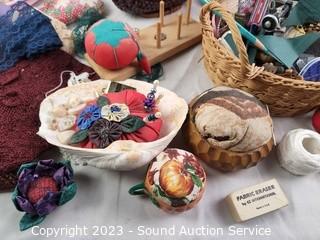 Lot Details: Needles, pin cushions, thread, doilies & more. Refer to photos for lot contents & more info.