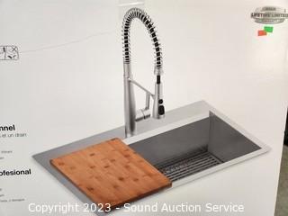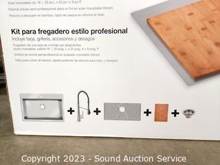 Lot Details: 18GA stainless steel, single basin, with semi-professional pull down faucet, bamboo cutting board, silicone sink mat, drain. 33" L x 22" W x 9" D. Appears new, unused, in original packaging. Serial RC78957-1PC-NA.