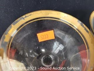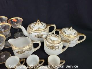 Lot Details: Noritake includes cream, sugar, teapot, 5 demitasse cups, 6 snack plates. 6 Crystal gold trim snack plates & 6 stemware goblets. Could use a good cleaning, Some wear to gold trim, refer to photos for more info.