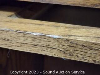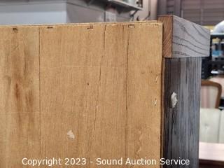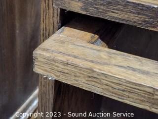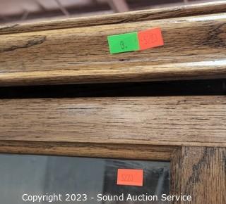 Lot Details: Some minor scuffs, light wear scuffs on bottom edge of doors, overall great condition. Particle board construction, wood fronts, oak veneer finish. 58" H x 32" W x 13" D.