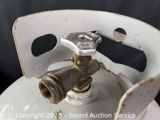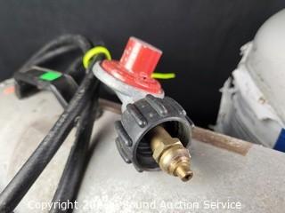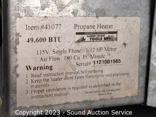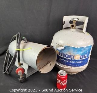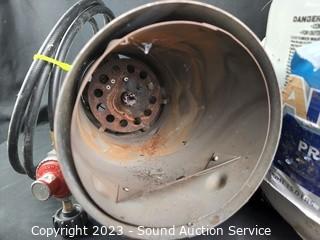 Lot Details: 46,900BTU heater, handle on top of heater is melting, tank is empty. 18LB tank, dated 5-15.