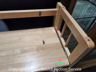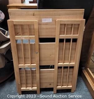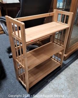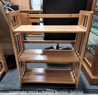 Lot Details: Has peg holes on the top to be stackable. 34" H x 27.5" W x 11" D. Some foam residue on the shelves.