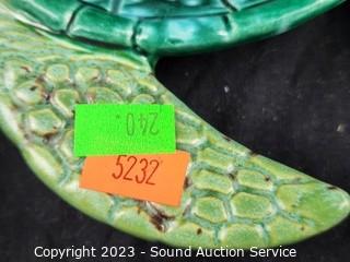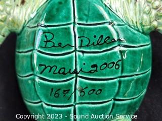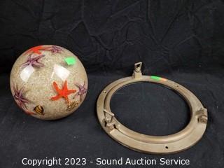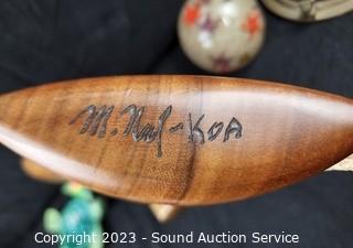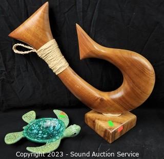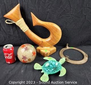 Lot Details: Hawaiian Wood Fish hook "Makau", has some scuffs, is signed (refer to photos), 14" H x 16" L. Heirloom art glass starfish 5" paperweight. 7" brass porthole. Signed Ben Dillan Turtle dish, 8" x 7".