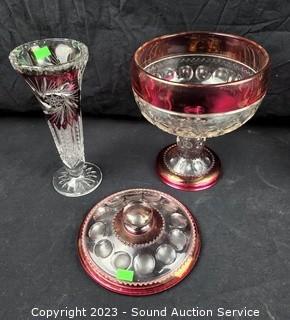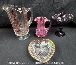 Lot Details: Compotes, heart dish, pitchers, vase. Up to 11" tall, 3" to 7" dia. Don't see any major issues.