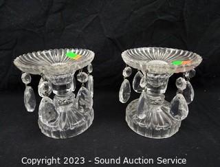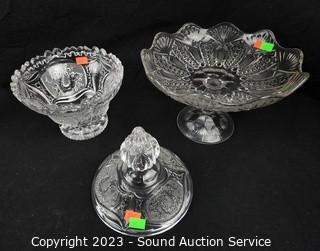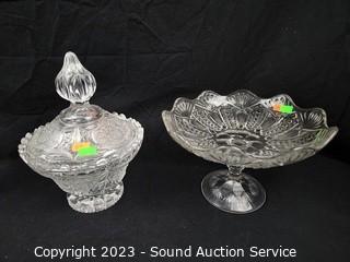 Lot Details: Prism accent candle holders, covered dish, votive, vases, compote. 4" to 9.5" tall, 4" to 8.5" dia. Covered dish & 1 candle holder both have a small chip on rim, don't see any other major issues.
