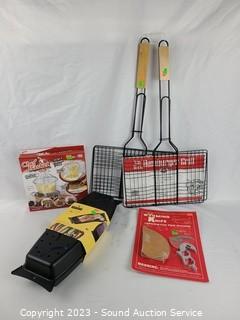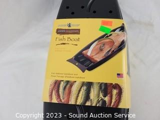 Lot Details: Nordic Ware Fish Boat, Chef Basket, 2 Grilling Baskets, Wyoming Knife. All in excellent, like new condition.