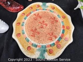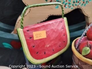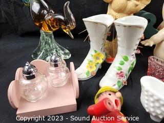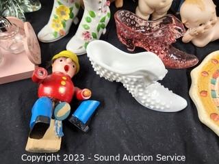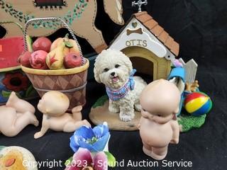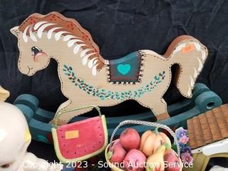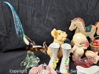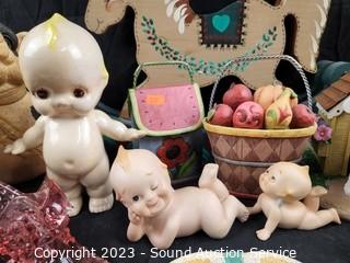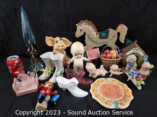 Lot Details: Art Glass bird figure, porcelain Kewpie figure 7" tall (various crazing), ceramic piggy bank, wood rocking horse decor, other Kewpie figures & more. Refer to photos for lot contents.