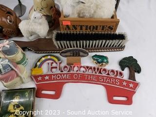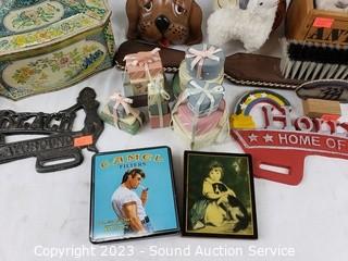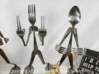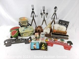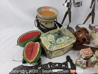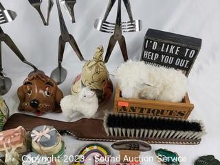 Lot Details: Metal art utensil figures, trinket boxes, wax burner, brush & more. Refer to photos for lot contents.