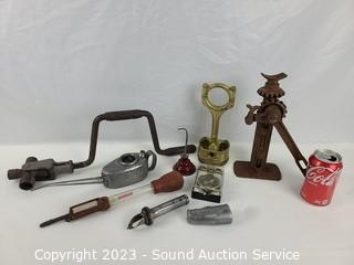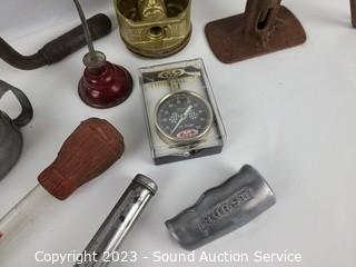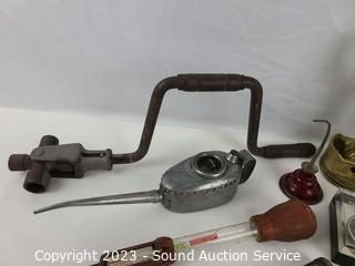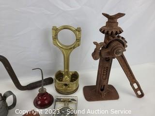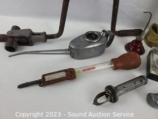 Lot Details: Piston CA16, screw jack, tire gauge, tire iron, shifter handle, oil cans & more. Refer to photos for lot contents.