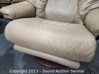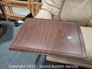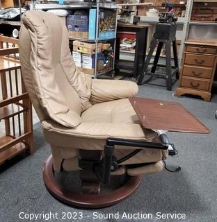 Lot Details: Comes with mounted articulating tray/table, foot rest power touch controls extends out. Genuine beige leather, in great condition. 41" H x 34" W x 18" to seat.