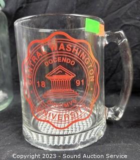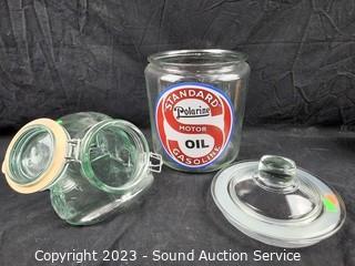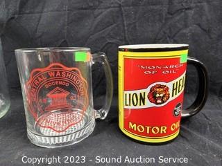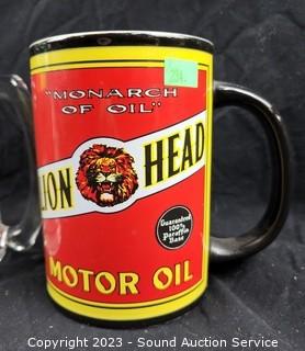 Lot Details: Lion Head Motor Oil & Central Washington Mug, Standard Gasoline Motor Oil Canister 8" H x 7" Dia, classic car canister, 6" H x 9" x 5.5".