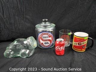 Lot #0234: Motor Oil Canister, Mug & VW Bug Car Canister