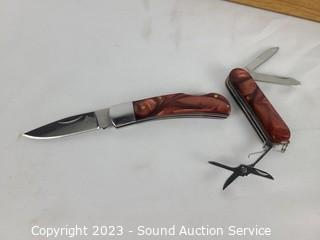 Lot Details: 5.5" folding knife with 1.75" blade. Comes with sheathe.