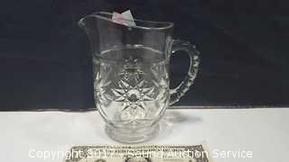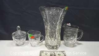 Lot #0233: Depression Glass Pitcher, Vase, Cream & Sugar