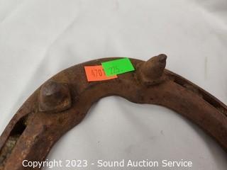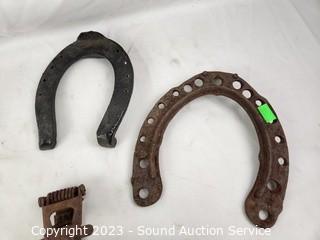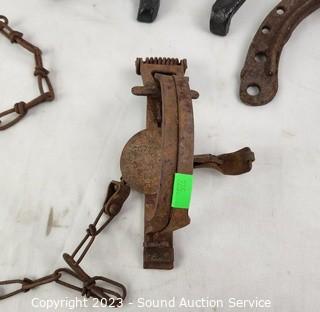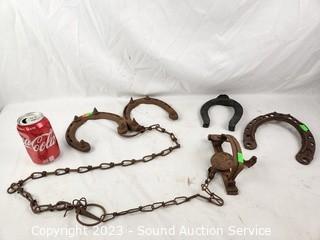 Lot #0225: 4pc Rustic Horse Shoes & Small Game Trap