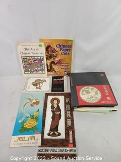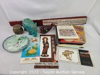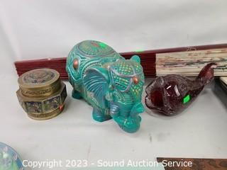 Lot Details: Hand painted 5ft Fan, Arnel's ceramic elephant, art glass fish, assorted literature. Refer to photos for titles & more information.