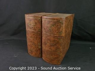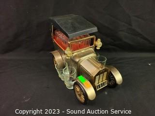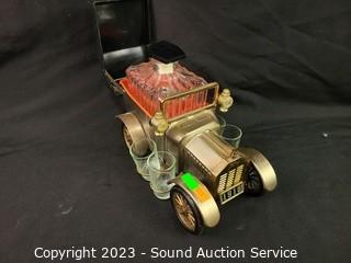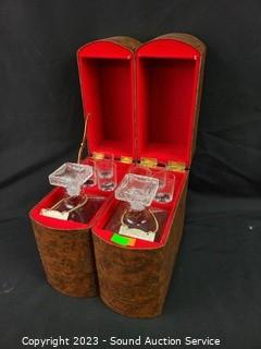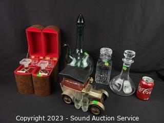 Lot Details: Crystal & clear glass decor, hidden bookcase decanter set with shot glasses, wine chiller decanter, vehicle decanter.