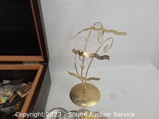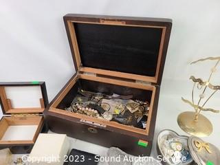 Lot Details: Compact, necklaces, necklace/earring & ring racks, necklaces, trinket boxes, etc. Refer to photos for lot contents. Largest 4.5" x 12" x 8.5".