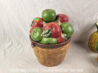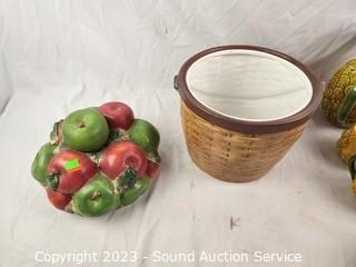 Lot Details: 6 Cups & 1 Pitcher Signed Baines, Apple Canister embossed Sakura David Carter Brown, 12" H x 9" Dia.