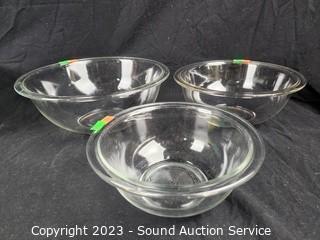 Lot Details: 3pc Clear Bowls & 2 blue & yellow bowl set. 7" to 9.75" Dia. & 5.75" to 8.75".