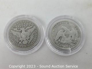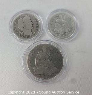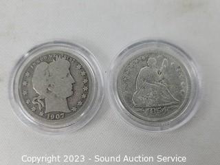 Lot Details: 1855 Seated Liberty Half Dollar, 1854 Seated Liberty Quarter, 1907 Liberty Head Quarter.