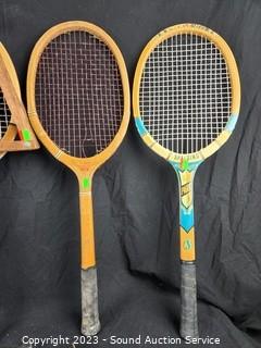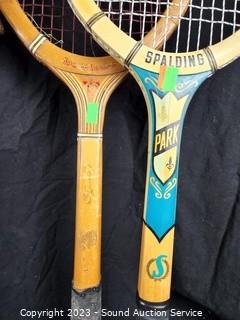 Lot Details: Vtg. Wilson Hardrick Signature tennis racquet (some damage), Phoenix racquet, Spalding Park, Spalding Paucho Gongales racquet. Refer to photos for condition & more information.