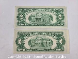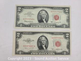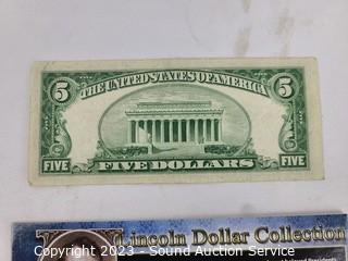 Lot Details: 1953 Red Seal $5 Note & Lincoln 2010 Presidential Dollar, 1953B & 1963 Red Seal $2 Notes. ATTN: We are not coin or currency experts or graders, please use your own judgement when bidding.