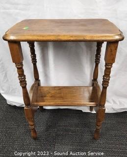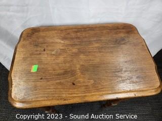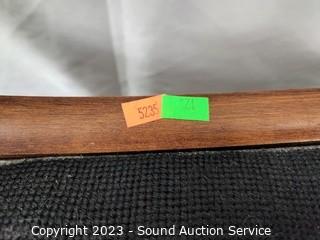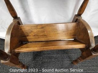 Lot Details: Chair 33" H x 16.5" W x 17" to seat. Some scuffs & wear to finish, accent and back rest are loose on the chair. Table has magazine/book rack bottom, 25" H x 18" x 11", some scuffs & wear to finish.