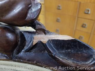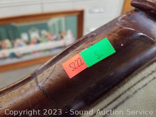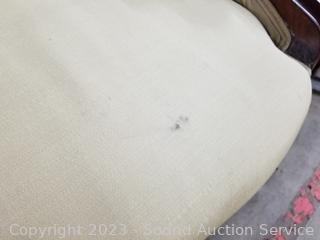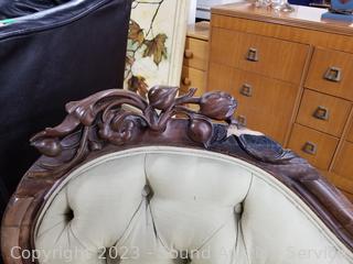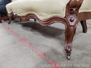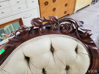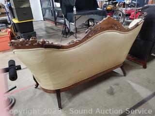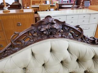 Lot Details: Ornately carved wood accents, see damage to top wood accent carving on one side. 40" H x 68" W x 14" to seat. Has brass casters on front legs. Consignors says it is similar to a piece displayed in the Smithsonian.