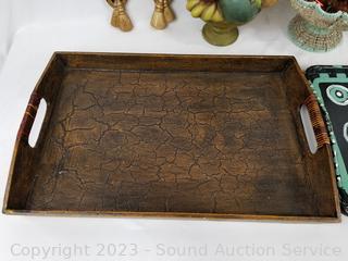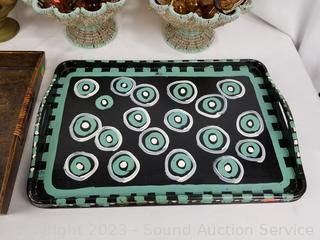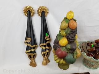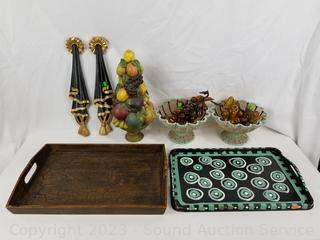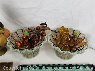 Lot Details: Fruit tower display (base has a crack), one tray painted by Ruth Moen artist from Seattle, beaded baskets, glass fruit. Refer to photos for more info.