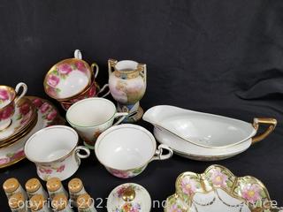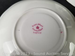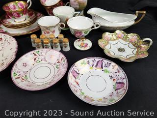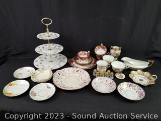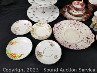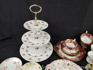 Lot Details: Lustre Ware Late 1800's, teacups, saucers, Royal Albert Appetizer tower, single server salt & pepper shakers, Phoenix England, Woodlands England, Royal Albert Olde English Roses & more.