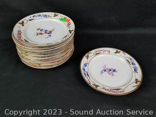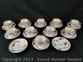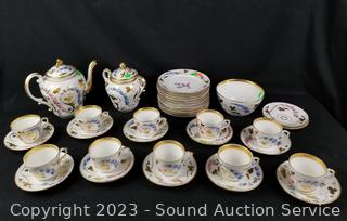 Lot Details: 10 cups, tea & coffee pots, 12 saucers, 10 snack plates, 6.5" bowl. Some wear to finish, one cup has a crack. Don't see a makers mark.