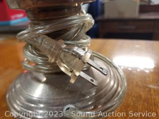 Lot Details: Works. Some tarnish on plate, glass base looks to have been cut in 2 for assembly, some chipping around the cut, refer to photos.