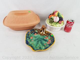 Lot #0072: Terracotta Roaster, Bird Plate, Fruit Dish