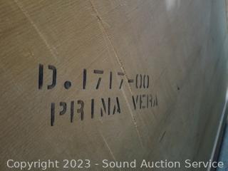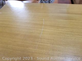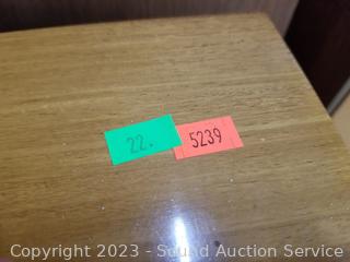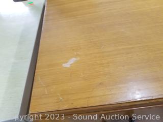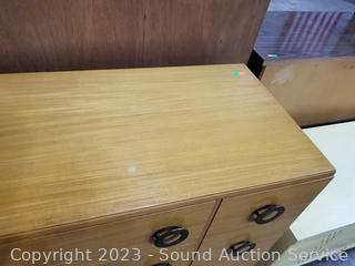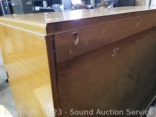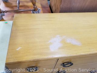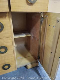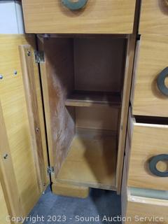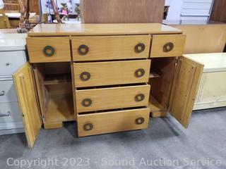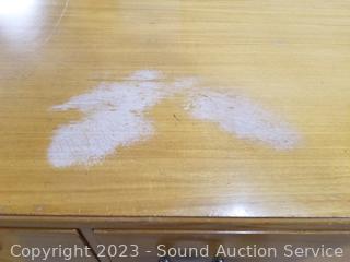 Lot Details: 36" H x 48" W x 18" D. 2 top side drawers are divided. , 2 cabinets on the sides. Left cabinet door doesn't latch. Some scuffs, scratches on finish. Appears to be solid wood construction.