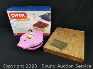 Lot Details: 4pc Pyrex Cookware, Cutting Board (both sealed) Strawberry Shortcake Maker (light use).