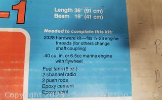 Lot Details: Consignor says it is complete, appears complete. 36" length, 16" beam. Electronics & engine not included. Some wear to packaging. Refer to photos for more information.