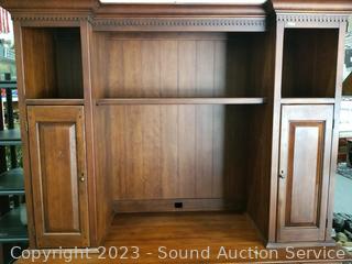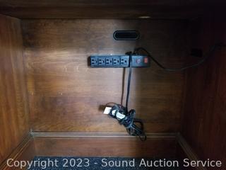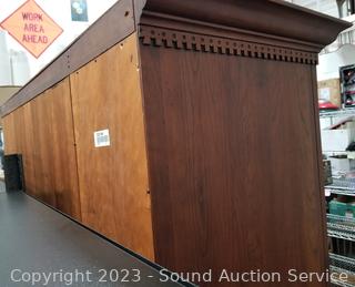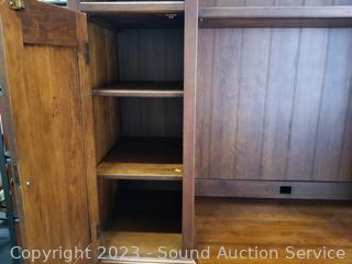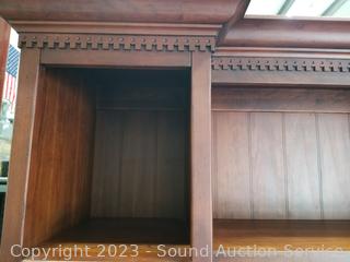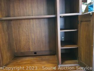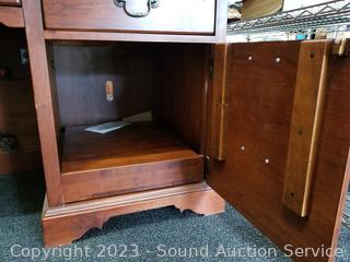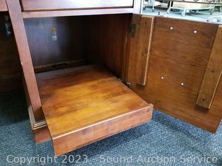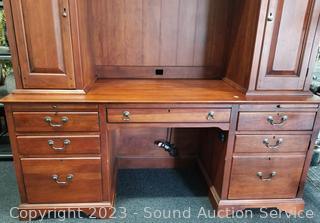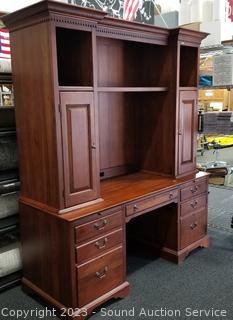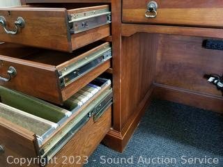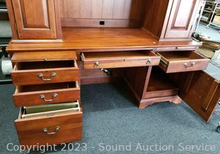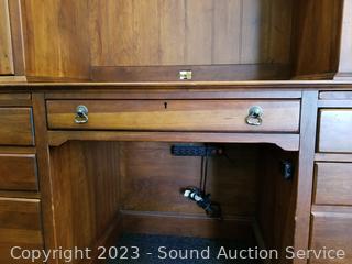 Lot Details: Appears to be solid wood construction, dovetail joinery, roller drawer guides, skeleton key locks, does not come with key, 7 drawers, pull out trays, cupboards with adjustable shelves, upper cubby storage, cord holes in the back. In excellent condition, notice a few minor scuffs on edges where a chair may have rubbed up against them, a few small scratches on the desktop. Overall 82" x 70" x 26".