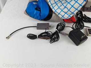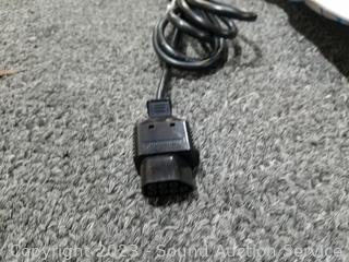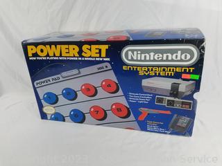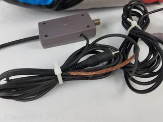 Lot Details: Console with 2 controllers, power pad, and game. Does not include gun. Cord for TV connection is damaged. Consignor says all units have power and work. Comes with original box.