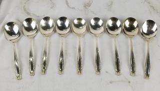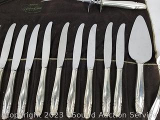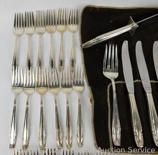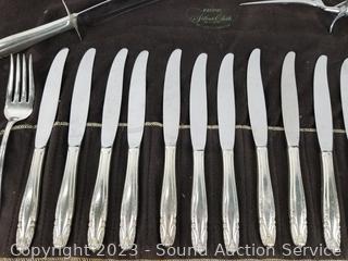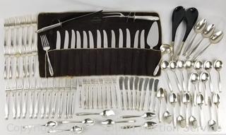 Lot Details: 15 teaspoons, 9 soup spoons, 12 dinner forks, 12 salad forks, 8 cocktail forks, ladles, 1 pickle fork, 13 butter knives, 1 cake server, 2pc carving set, 2pc salad spoons, 1 jelly spoon, 8 spread knives, 1 large fork. TW:5.4lb, 5lb 7oz, 2450g, 2.45kg.