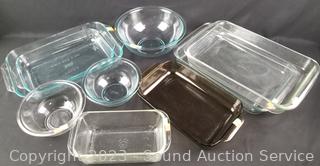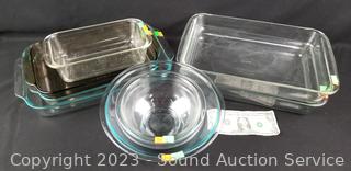 Lot #0112: 9 Pyrex Glass Baking Pans & Mixing Bowls