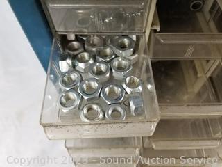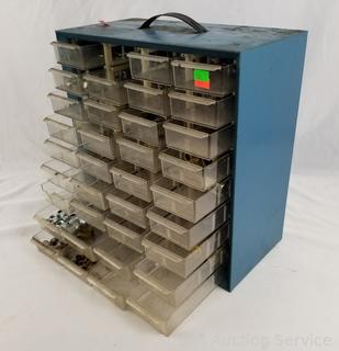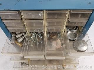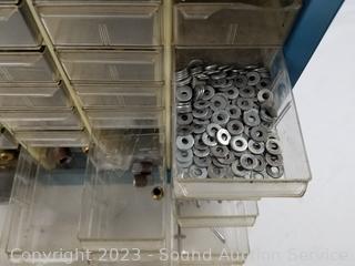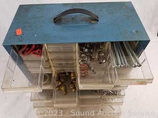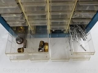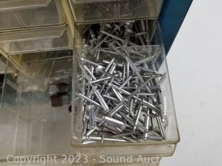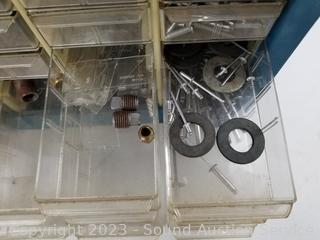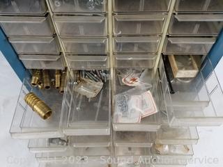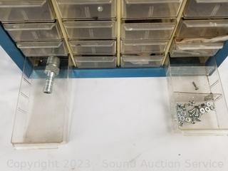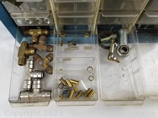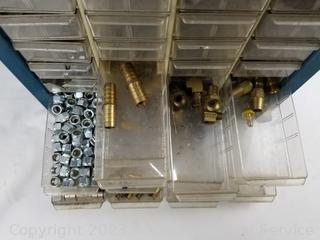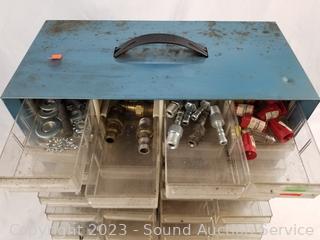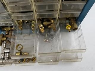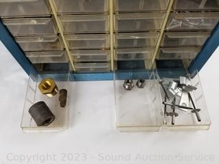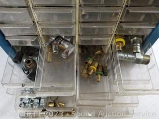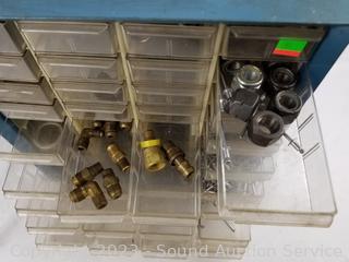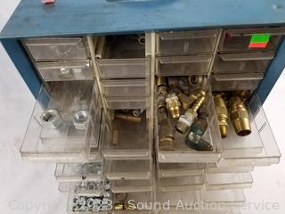 Lot Details: Air fittings, washers, rivets, nuts, etc. 13.5" H x 13" W x 6.25" D. Some drawers have damage, 1 is missing a drawer. Refer to photos for lot contents.