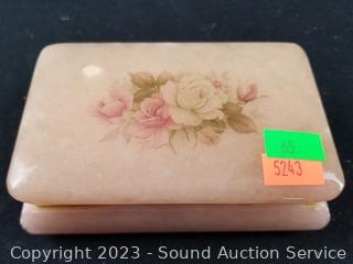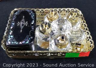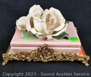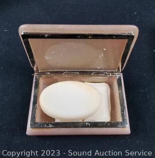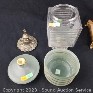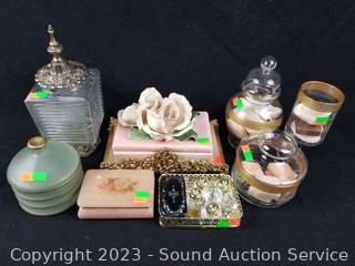 Lot Details: Soaps, quartz powder dish, crystal prism drawer pulls, porcelain rose dish, vanity trays & more.
